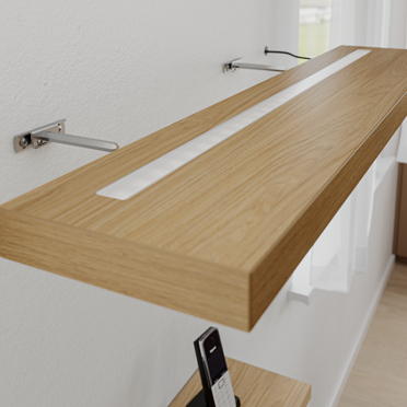 Die massiv anmutenden Wandregale verdanken ihre schwebende Optik und stabile Konstruktion unseren Hettich Titan-Regalbodenträgern. Sie stehen für unterschiedliche Plattenstärken zur Verfügung. Wir haben uns in diesem Fall für das Modell Titan 1 mit Seitenverstellung entschieden.