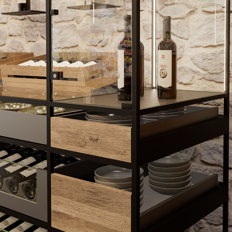 An unserem Verkaufsmöbel sieht man rechts und links jeweils eine beleuchtete Vitrine mit 4 mm starken Glasböden. So kommen die ausgestellten Weinfaschen gut zur Geltung. Darunter wurden AvanTech You-Schubkästen mit Fronten in Altholzoptik eingesetzt. Zwischen den beiden Vitrinen gibt es weitere Korpuselemente mit Schubkästen. Jeweils mit der passenden ActroYou-Führung. Die Abdeckung des filigranen Möbels bildet eine Glasplatte. Da man durch sie auch von oben auf die Führung blicken kann, gehören zum Cadro-System auch entsprechende Blenden.