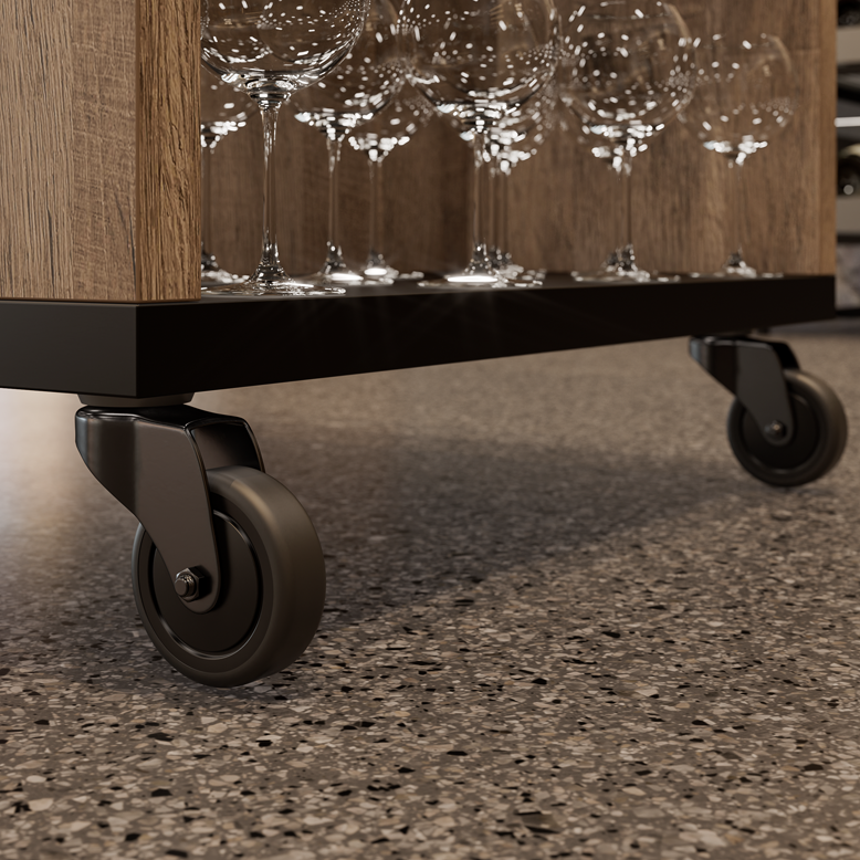 In unserem Fall wurde eine schwarze Apparaterolle mit einer Belastbarkeit von 60 kg ausgewählt. Zwei der Lenkrollen verfügen zusätzlich über einen Feststeller. Wer Farbe in den Raum bringen möchte, wählt den Artikel in einer der Farbkombinationen Natur/Hellblau, Rot/Schwarz oder Schwarz/Grün.