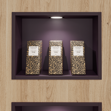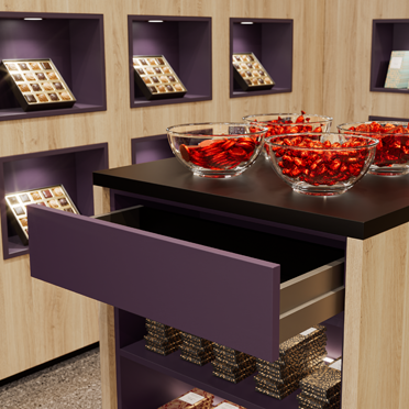 Dieser Ladenbereich soll vor allem Kunden mit erlesenem Geschmack und Freude am Genuss ansprechen. Das beeinflusst natürlich die Auswahl der eingesetzten Materialien. Um einen geschmackvollen Farbtupfer in den Raum zu bringen, haben wir die extrem matte und hochwertige Fenix NTM Bloom-Oberfläche in der Farbe Viola Orissa gewählt. Bei dem Dekor handelt es sich um eine der sechs neuen Farben aus der Kollektion von Arpa Industriale. Damit Sie die hochwertigen Elemente nicht selbst fertigen müssen, erhalten Sie sie bei uns auch als einbaufertige Möbelteile in drei Stärken. Sie können diese in unserer Konfiguratorwelt ganz nach Ihren individuellen Abmessungen mit Kanten oder Griffprofil online konfigurieren.