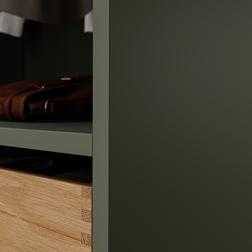 Vom Bett aus blickt man auf einen Raumtrenner aus Echtholzlamellen – eine Neuheit in unserem Sortiment! Sie lassen von allen Seiten Licht in den Raum und sorgen so für eine helle und luftige Atmosphäre. Dahinter befindet sich ein großer Kleiderschrank mit hochwertigen Echtholzschubkästen. Für den Korpus haben wir eine ABS-Kante in Grün gewählt. Durch die Kombination der naturnahen Farben entsteht ein beruhigender Look, der viel zu schade ist, um ihn hinter geschlossenen Schranktüren zu verstecken.