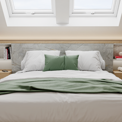 Aus dem Bad gelangt man durch die offene Ankleide direkt ins Elternschlafzimmer. Hier wurde der Platz hinter dem Bett geschickt als Stauraum genutzt. So wirkt der Raum großzügig und strahlt gleichermaßen Ruhe und Gemütlichkeit aus. An der Rückwand gehen graue Rillenfronten Ton in Ton in ein modernes Sibu-Dekor in Steinoptik über. Letzteres verbreitet mit seinen zarten goldenen Adern einen Hauch von Luxus. Am Nachttisch befindet sich ein zusätzliches Plus an Komfort: unterhalb der Arbeitsplatte sorgt ein QI-Charger dafür, dass man das Smartphone auch ohne störende Kabel laden kann.