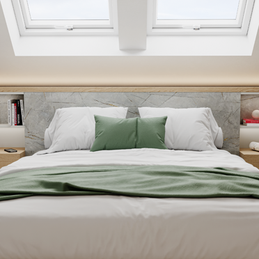 An der Wand hinter dem Bett sieht man das Dekor DM Limestone Grey, eine mit zierlichen goldenen, weißen und schwarzen Adern durchzogene Kalksteinoptik. Durch den grauen Grundton mit den goldenen Akzenten wirkt die Rückwand modern, aber nicht kühl. Der natürliche Look und der warme Goldton passen hervorragend zu den Naturholzelementen und dem Grünton des Kleiderschranks.