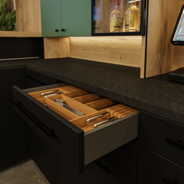Stabilität mit System: Der in die Vionaro Zarge integrierte Frontstabilisator ermöglicht hohe Fronten bis 780 mm – ganz ohne Reling. Zusätzlich sorgen der bereits in die Zarge integrierte Rückwandhalter und die einschlagbaren Bodenkrallen für geringe Teilevielfalt und eine effiziente Verarbeitung.