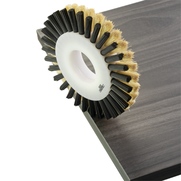 Dabei werden die herkömmlichen textilen Schwabbelscheiben durch eine neuartige Bürste mit einer abgestimmten Kombination aus leicht abrasiven Polyamid- und weiche Naturfaserborsten ersetzt. Dank einer neu entwickelten Universalaufnahme können die Texture Finish Bürsten an die vorhandenen Schwabbelscheibenmotoren montiert werden. Ein speziell auf die Bürste abgestimmtes Trennmittelsprühsystem verhindert das Anhaften von Klebstoffresten an Bürste und verlängert so die Standzeit. Gleichzeitig werden die Oberflächen bei der Verarbeitung geschont.