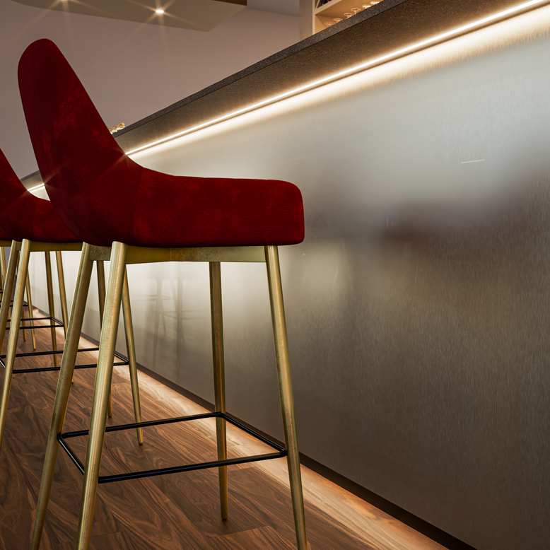 Unter der Arbeitsplatte sowie unterhalb der Fußstütze betonen hochwertige LED-Strips mit ihrem einladenden Licht die elegante Rundung der mattschimmernden Sibu-Oberfäche. Wir empfehlen Ihnen für ähnliche Anwendungen unseren LED-Strip Halemeier Versa SuperPlus. Die Möbelleuchte ist durch eine Kunststoffhülle vor Nässe und Staub geschützt. Man benötigt keine zusätzlichen Leuchtenkanäle für den Einbau. Dank der Flexibilität sind eine seitliche Biegung und somit auch die mühelose Montage an runden Möbelstücken problemlos möglich. Sie erhalten Versa SuperPlus bei uns in den Längen 2500 und 5000 mm sowie mit den Lichtfarben Neutralweiß und Warmweiß.