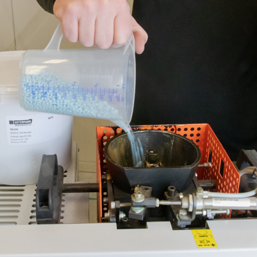 Empty the gluepot, switch off the heating system, pour cleaner into the basin while it is still hot and until all incrustations are covered, and leave to act for approx. 20 - 30 minutes. If necessary, you can heat up the hotmelt vessel again briefly. Finally, remove the cleaner through the drain of the gluepot.