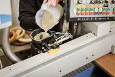 Hotmelt adhesives are based on different raw materials and are processed when hot. Most common are adhesives based on ethylene vinyl acetate (EVA) that pertain to thermoplastics and can therefore be repeatedly melted. Adhesives based on polyurethane (PUR) on the other hand harden chemically and ensure a lasting bond. Both types are used on edgebanding machines for the bonding of plastic, paper and wood edgings. Depending on the type of machine, the use of granules or the relevant hotmelt adhesive cartridges is necessary. The small 2.5 kg bags and the possibility to purchase single cartridges make it easier to quickly switch to different colours.
