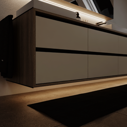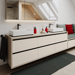 Le caisson de notre meuble est mis en valeur par des poignées encastrées et des profilés de protection d’angles au coloris noir mat. La combinaison de ce coloris foncé à celui des façades claires apporte au meuble non seulement un design moderne et linéaire, mais crée également une profondeur optique supplémentaire grâce à des contrastes efficaces. Les vasques rectangulaires à poser d'Alape renforcent encore cet aspect rectiligne.