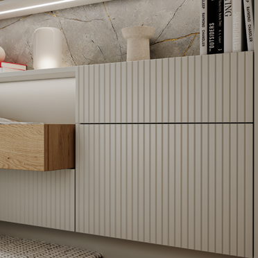 Per le superfici a vista abbiamo scelto le tanto apprezzate antine 3D "Scanalatura 20" nel colore Ash Grey Perfect Feel. La superficie grigio cenere opaco e il delicato gioco di luci e ombre delle eleganti scanalature si abbinano armoniosamente con il decoro Sibu effetto pietra.