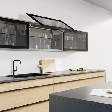 Het eendelige front opent parallel aan de kast en kan in elke positie worden vastgezet. De klepliftsystemen bewegen elegant, zijn uiterst stabiel en zijn uitermate geschikt voor kasten met keukenapparatuur.
