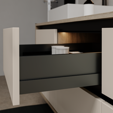 Voor de lades hebben wij gekozen voor het dubbelwandige ladesysteem Nova Pro Scala van Grass in de trendy, nieuwe kleur zircon. De donkere zijwanden geven het meubel iets extra‘s aan design.