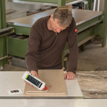 Decorplaten centraal op de draagplaat positioneren en met een persdruk van 0,5 N/mm² persen. Bij 20°C bedraagt de perstijd circa 30 minuten. De maximale perstemperatuur is 45°C.