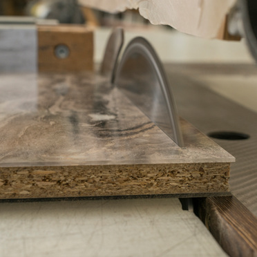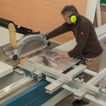 De platen kunnen met gangbaar gereedschap gezaagd/ gesneden worden. De designplaten groter afsnijden/ afzagen dan het houten plaatmateriaal.