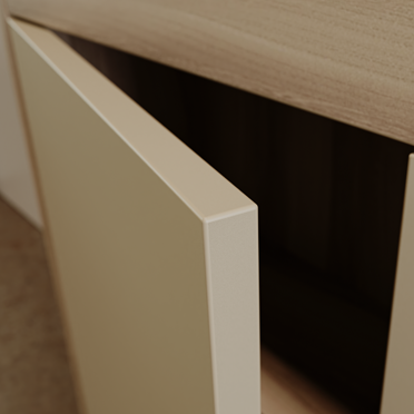 Het Eiken van onze handleuning en traptredes komt terug in de garderobekast met een breed generfd decor met onze passende ABS kant Ulme Baron glad. Aan de binnenwand hebben wij onze ABS kant Dune Beige miniperl met een effen zandkleur verwerkt, die ook in de open vlakken van de kast terugkomen. Er zijn slechts enkele nuances in de gekozen kleuren. Door de verschillende oppervlaktestructuren krijgt het interieur een harmonieuze, bijzondere look.